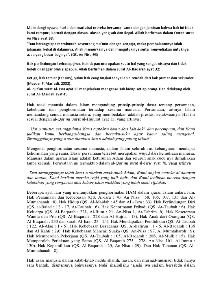 MENELUSURI KONSEP HAM DALAM PIAGAM MADINAH Ridhatullah Assyabani Dosen Sekolah Tinggi Ilmu Alquran STIQ Amuntai Kalimantan Selatan. Meskipun Islam sering dituduh Barat melakukan pelanggaran HAM namun faktanya banyak sekali ayat ayat suci Al-Quran yang punya relevansi dengan Hak Asasi Manusia. 3 Ayat Alkitab Tentang Pelanggaran HAM Dalam Ajarannya.
